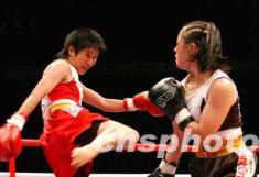 女子表演賽首次進入中國武術散打王爭霸賽,圖為河南隊劉瑞清與湖北隊廖啟燕(右)在48公斤級比賽中。