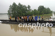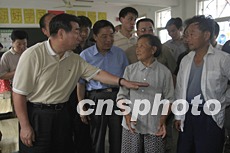七月六日,國務院副總理回良玉(圖左1)專程到安徽滁州,看望已得到安全轉移的受災群眾。中新社記者:盛佳鵬