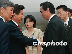 韓國總統盧武鉉七日飛抵北京開始其訪華行程,外交部副部長王毅前往機場迎接。中新社記者:滿會喬