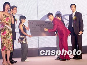 歌星許志安7月10日在香港與正東唱片公司續約,獲唱片公司高層送上越野車助慶,擔任大會司儀的鄭裕玲為他高興。作者:鄧慶樂