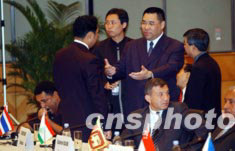 龍永圖與澳門社會事務及文化司長崔世安交談博鰲亞洲論壇秘書長龍永圖,7月15日在香港主持“新形式下國際旅游合作大會”的部長圓桌會議時,與澳門社會事務及文化司長崔世安親切交談。中新社記者:洪少葵