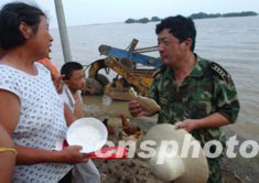 七月中旬的淮河洪水迫使安徽省穎上縣多處行洪區緊急破堤行洪,許多百姓被困在滔滔洪水中的高臺地帶,救濟成為當務之急。圖為洪水圍困邱家湖行洪區堤上的農民。中新社記者:賈國榮