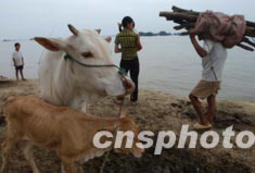 安徽省穎上縣半崗鎮空臺村的一千多名男女老少,因邱家湖七月十二日破堤行洪而被洪水四面圍困,百姓和牛羊家畜擠在孤土堤上,衛生條件令人擔憂。中新社記者:賈國榮