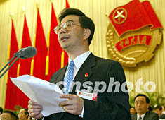 中共中央政治局常委吳官正二十二日在北京向中國共青團十五大致祝辭。中新社記者:滿會喬