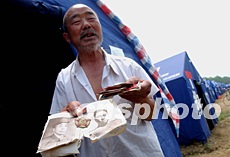 溫家寶總理七月十二日在安徽省阜南縣王家壩看望的七十二歲災民鄭治學,原來是抗美援朝老戰士,他至今在救災帳篷里保存著當年志愿軍彭徳懷司令員和朝鮮金日成將軍的圖片等紀念品。中新社記者:賈國榮