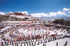 “八一”前夕,武警西藏總隊組織駐拉薩部隊官兵在布達拉宮廣場舉行“慶祝建軍七十六周年藏歌藏舞文藝匯演”,千余名武警官兵和藏族群眾跳起大型鍋莊舞,布達拉宮廣場成了歌舞的海洋。作者:趙艷志