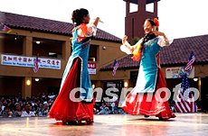 北加州華人運動會好時威之夜頒獎晚會七月二十六日晚在美國圣荷西市舉行,生活在美西灣區的華裔演藝人士為頒獎晚會獻上了精彩的演出。圖為中華演藝學院的學員表演蒙族舞《情思》。作者:陳鋼