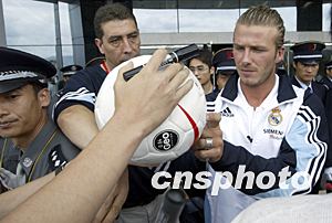貝克漢姆為狂熱的中國(guó)球迷簽名。中新社記者:毛建軍