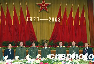 中新社北京七月三十一日電 中國國防部三十一日在北京舉行盛大招待會慶祝建軍七十六周年。中央軍委副主席、國務(wù)委員兼國防部長曹剛川上將致祝酒詞。中央軍委委員、總政治部主任徐才厚上將,中央軍委委員、總參謀長梁光烈上將,中央軍委委員、總后勤部部長廖錫龍上將,中央軍委委員、總裝備部部長李繼耐上將出席了招待會。