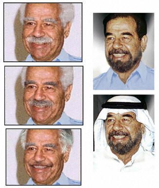 據路透社報道,這些照片包括通常蓄髭且深發的薩達姆若留胡須、把臉刮干凈、白發或灰發的模樣,還有一張為他戴著傳統阿拉伯頭巾的樣子。這些照片都已經發給正在伊拉克全力搜索薩達姆的軍隊。