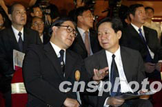 出席儀式的香港嘉賓霍震霆與國務院港澳辦副主任陳佐耳一起交談。