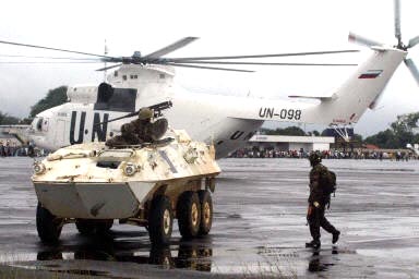在瓢潑的大雨中,大約300名尼日利亞士兵乘坐兩架聯合國的直升機出現在離首都蒙羅維亞45公里的羅伯茨菲爾德機場。