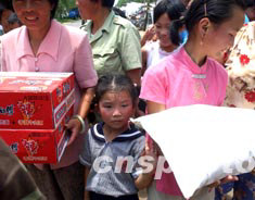 圖:高溫中的淮河災民獲得軍方捐贈食品