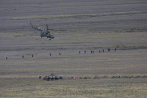 8月7日,哈薩克斯坦烏恰拉爾某空軍基地。平靜的晴空中,傳來飛機的轟鳴,兩架蘇—27戰斗機,緊緊擠壓著一架安—26型客機,向機場跑道滑落,驚險緊張的反劫機演習正在進行。同一天,五國部隊還進行了“解救人質”演習。