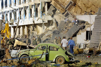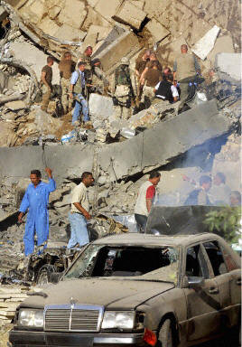 聯(lián)合國駐巴格達總部“運河賓館”于19日發(fā)生了一起大爆炸,爆炸造成了數(shù)十人受傷,房屋受到嚴重毀損,兩層高的“運河賓館”整整一個角被炸塌。