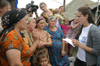 作為聯合國難民事務高級專員公署的“親善大使”,好萊塢影星安吉莉娜·朱莉22日探訪了俄羅斯北高加索地區靠近車臣邊境的貝拉難民營,受到車臣難民的熱情歡迎。朱莉自從2001年被聯合國難民署任命為“親善大使”以來,已經實地訪問了世界多個國家的難民營。