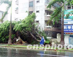 今年第十二號臺風(fēng)“科羅旺”二十五日凌晨在海南省文昌市翁田鎮(zhèn)登陸,登陸時臺風(fēng)中心風(fēng)力達(dá)十二級。海口市海府路一些大榕樹被刮倒。作者:莫成雄