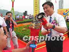 2003年9月2日上午,中華人民共和國第六屆殘疾人運動會火炬傳遞起跑儀式在南京市白馬公園舉行,江蘇省委書記、第六屆全國殘運會組委會顧問李源潮用采集的火種點燃主火炬,并點燃舉重奧運冠軍張海東手中的火炬。作者:丁東升