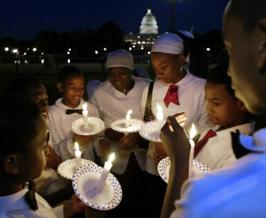 10日晚,在美國華盛頓國會大廈前,一教會的孩子們點燃蠟燭將以守夜方式紀念“9·11”這個另美國人難以忘記的慘痛事件。與此同時,這種自發的守夜活動還將在美國全境展開。