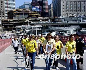 紐約十一日上午在世貿廢墟舉行“九一一”兩周年紀念儀式,數千紐約人走進世貿廢墟最底層悼念罹難者。中新社記者:趙海燕