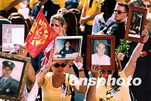 在“九一一”恐怖襲擊事件中逝去的紐約消防員親屬們,手舉親人的照片,參加在世貿中心遺址舉行的紀念活動。作者:龔文謨