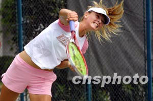 十五日,上海大眾·Polo公開賽正式開賽。特別是目前人氣正旺的俄羅斯美少女莎拉波娃的參賽吸引了眾多球迷前來觀戰。圖為莎拉波娃在賽前訓練。作者:湯彥俊