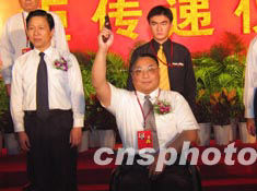 圖:鄧樸方為中國殘運會火炬傳遞鳴槍