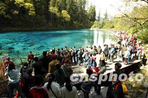 中國內地“十一”黃金周開始,世界自然遺產、著名風景區九寨溝迎來大批觀光客,風景秀美的五彩池被游客團團包圍。中新社記者:毛建軍
