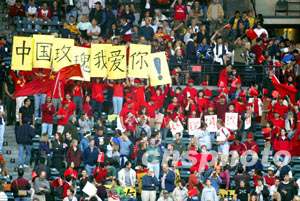 北京時間10月3日,在2003女足世界杯四分之一決賽中,中國女足0比1不敵加拿大隊,抱憾告別本屆世界杯。圖為在波特蘭的中國留學生和華人華僑組成的啦啦隊打出橫幅為中國隊加油。作者:劉占坤