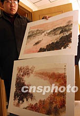 中貿圣佳國際拍賣公司2003年拍賣會將于十一月一日在北京舉行,傅抱石作品《毛主席詩意山水冊八開》等稀罕珍品成為拍品中一道靚麗風景。該畫作由傅抱石先生在1964、1965年內為生前摯友維楨所繪,是作者經心閱讀《毛澤東詩詞》后激情創作的八幅佳構。圖為工作人員十月中旬展示其中的兩幅《寥廓江天萬里霜》(下)與《芙蓉國里盡朝暉》。中新社記者:武仲林