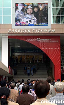 香港市民10月15日聚集在尖沙咀海港城大屏幕前,觀看中國(guó)太空第一人楊利偉登上神舟五號(hào)飛船升空消息。作者:洪少葵