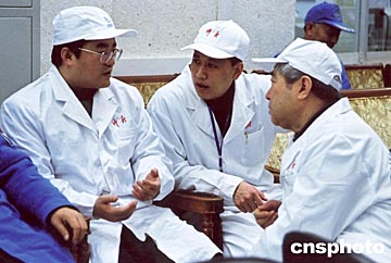 神舟五號載人飛船十月十五日上午九時在酒泉衛星發射中心載人航天發射場發射升空。圖為中國載人航天工程副總指揮張慶偉(左)、中國神舟飛船總指揮袁家軍(中)和中國神舟飛船總設計師戚發軔(右)在一起交流工作。中新社圖
