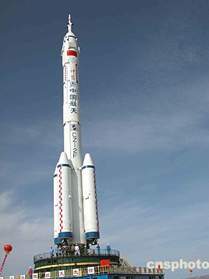 轉(zhuǎn)運途中的“神舟”五號載人 飛船船箭塔組合體直指蒼穹