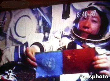 中國首位航天員楊利偉乘坐“神舟”五號飛船在太空飛行時展示聯合國旗幟與中國國旗。“神舟”五號飛船北京時間十月十六日六時二十三分在內蒙古中部地區成功著陸,中國首次載人航天飛行任務獲得圓滿成功。作者:賈國榮