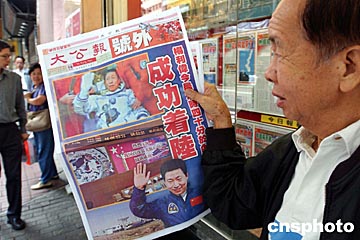 中新社香港十月十六日電中國首次載人航天的“神舟”五號今晨成功著陸后,香港《文匯報》、《大公報》以第一時間印出號外,市民紛紛搶閱。今天出版的香港主要報章,除圖文并茂地大幅報道“神舟”五號的相關消息外,還分別發表社評,祝賀這一壯舉。