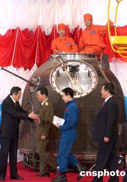 十月十八日,中國神舟五號載人飛船回收艙搭載物品開艙儀式在中國航天科技集團公司北京空間技術研制試驗中心舉行。中國首位航天員楊利偉向相關部門代表轉交從太空歸來的“貴賓”。搭載物品中包括來自臺灣地區的作物種子。中新社記者:張煒