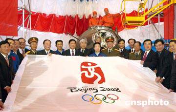 十月十八日,中國神舟五號載人飛船回收艙搭載物品開艙儀式在中國航天科技集團公司北京空間技術研制試驗中心舉行。中國首位航天員楊利偉、北京奧組委主席劉淇、中國載人航天工程總指揮李繼耐等共同展示從太空歸來的2008北京奧運會會徽旗幟。中新社記者:張煒