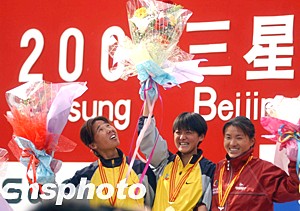 前不久在法國巴黎世界田徑錦標賽上取得一枚銅牌的孫英杰是二00三年三星北京國際馬拉松賽女子組唯一的奪冠“大熱門”。在比賽過程中,孫英杰始終處于領跑的第一集團之中,并于后半程脫穎而出,最終以二小時十九分三十九秒的成績輕松奪得女子組冠軍,創造北京國際馬拉松賽女子組歷史最好成績。