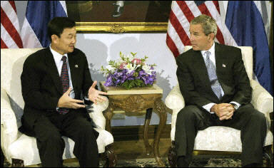 報道稱,布什及夫人勞拉于周六晚些時候到達(dá)泰國。在嚴(yán)密的保安措施之下,布什與泰國總理他信舉行了會晤。據(jù)其隨從透露,布什將授予泰國“美國在北約外主要盟國”地位,并將給泰國提供一系列的援助,以感激泰國兩月前抓獲了“伊斯蘭團”主要領(lǐng)袖漢巴里和其它的反控努力。