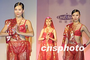 著名內衣品牌歐迪芬,二十一日晚在上海舉行了一場“華夏文化內衣秀”,推出多款具有民族風情的新款內衣,奪人眼球。中新社記者:湯彥俊