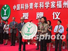 中國科協青年科學家福州活動基地二十三日舉行隆重的授牌儀式。中共中央委員、中國科協副主席張玉臺(前左一)宣布“福州基地”成立,并與中共市委副書記雷春美(右一)共同向“福州基地”授牌。“福州基地”是中國科協在全國設立的第二個青年科學家活動基地,旨在為海峽兩岸青年科學家搭起科技交流、合作的新平臺。中新社記者:劉可耕