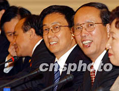 十月二十七日,滬港經貿合作會議在香港禮賓府舉行,圖為上海市市長韓正(中)、上海市副市長周禹鵬(右)等上海高官出席該會議。中新社記者:潘索菲