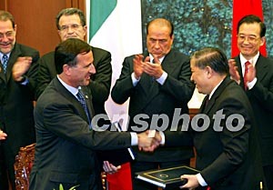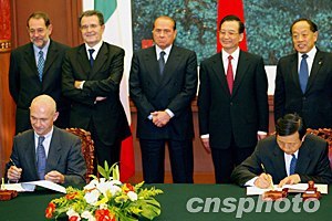 中國與歐盟三十日在北京簽署伽利略衛星導航合作協定等三個文件。中國國務院總理溫家寶、歐洲理事會主席意大利總理貝盧斯科尼(后左三)、歐盟委員會主席普羅迪(后左二)、歐盟共同外交與安全政策高級代表索拉納(后左一)共同出席簽字儀式。鄭萍萍 攝