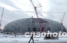 六日晚至七日晨,一場大雪突襲北京。正在建設的國家大劇院穹形屋頂鋼結構骨架被大雪覆蓋,安裝焊接工作被迫暫停。中新社記者:張煒
