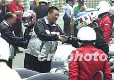 第五十屆澳門格蘭披治大賽車九日進(jìn)行正式比賽,澳門社會(huì)文化司司長(zhǎng)崔世安等賽前與參賽車手握手,鼓勵(lì)他們賽出好成績(jī)。中新社記者:李剛