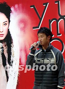 香港歌手鄭希怡15日在時代廣場舉行新碟發布會,“師弟” 吳浩康到場獻唱助威。中新社記者:譚達明