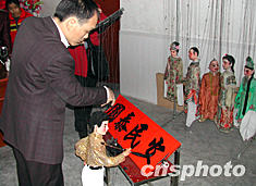 中國木偶表演大師李新賢正在用十四根細小的棉線操縱一只小小木偶寫出一幅筆劃遒勁的毛筆書法,被譽為“梅州一絕”、木偶神手。作者:卜瑜