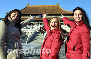 參加世界小姐大賽的各國佳麗十一月二十日參觀了北京著名的故宮博物院,雄偉的太和殿讓佳麗們眼界大開。中新社記者:廖文靜