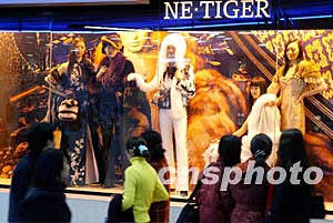 北京東方新天地內一家經營皮草服飾的商家二十九日以真人模特在櫥窗內展示,吸引眾多過往顧客的目光。中新社記者:毛建軍
