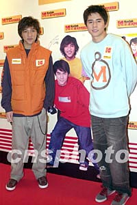樂壇組合Shine成員黃又南、徐天佑12月2日在香港出席《Kodak數碼沖曬多面睇》記者會,Kodak更設計了一套三款的「Kodak ×Shine 2004慈善相片年歷」予香港世界宣明會作慈善用途。中新社記者:鄧慶樂